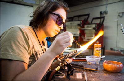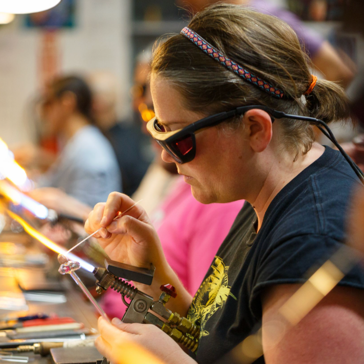 Whether you book by the hour or the day, it’s a comfortable, supportive studio to practice, experiment, and continue developing your glassblowing skills. Designed for returning students and experienced flameworkers, it’s the perfect place to keep learning, creating, and exploring your craft.